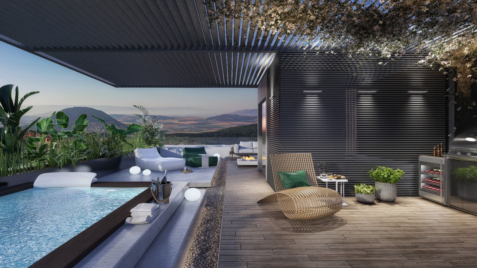 קומת גג ROOF TOP, פרגולה, ג’קוזי, מטבח חוץ, אזור ישיבה מרווח.